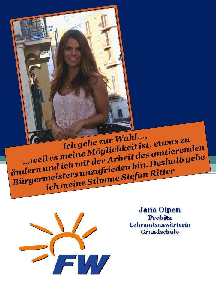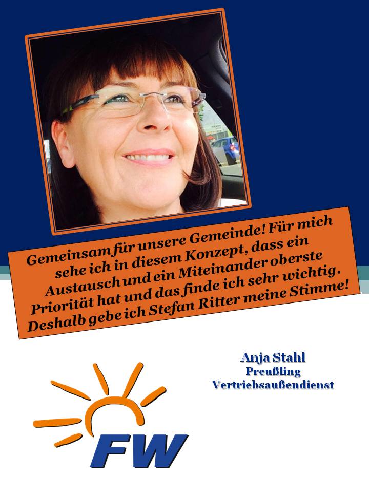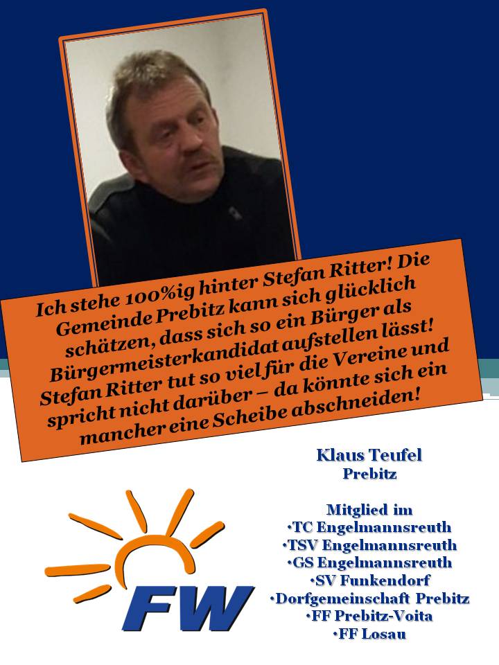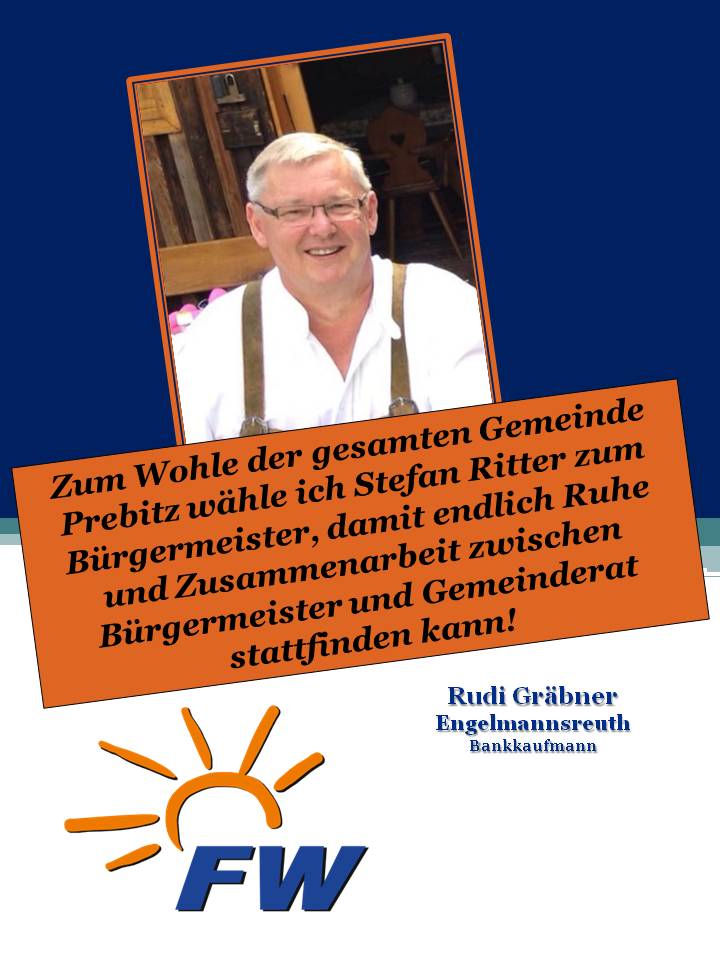 Uns haben die verschiedensten Wähler und Wählerinnen aus unterschiedlichsten Alters- /Berufsgruppen und Ortschaften der Gemeinde Prebitz angesprochen, ob sie nicht für die FWG und vor allem für unserem Bürgermeisterkandidaten Stefan Ritter werben dürfen.